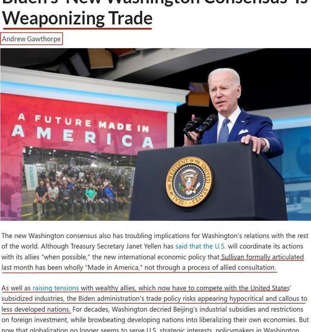 文章稱,雖然美國聲稱將在“可能的情況下”與盟友協調行動,但是沙利文闡述的美國新國際經濟政策完全是“美國制造”,并未與盟友協商。“這些盟友現在不得不在美國補貼的行業里與美方進行競爭”。