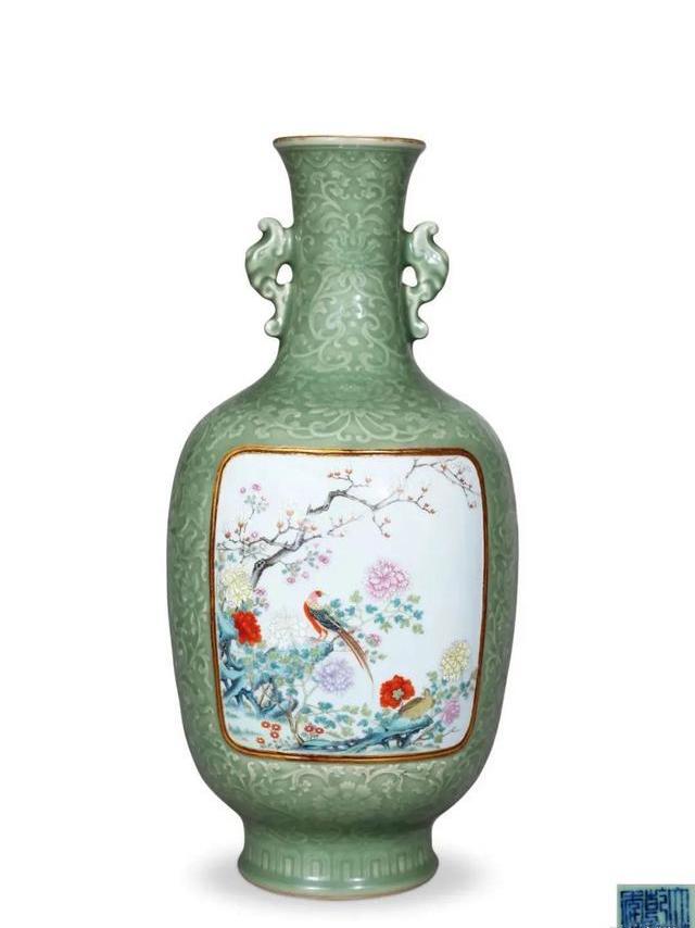 清乾隆冬青釉模印洋蓮開光粉彩花鳥錦雞圖鳩耳瓶