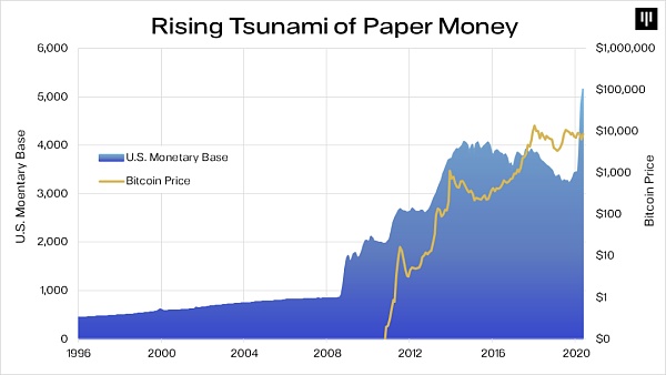 比特幣是應對印鈔而誕生的。在這10年前所未有的大量印鈔的時間里,比特幣的價格成倍的上漲。現在世界上正在發生的事情和這是同一個數量級的。