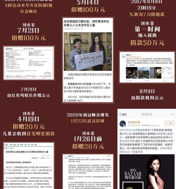 2021年夏天河南暴雨,劉亦菲毫不猶豫捐助了100萬,2017年九寨溝發生7.0級地震,劉亦菲也第一時間加入援助,捐款50萬。