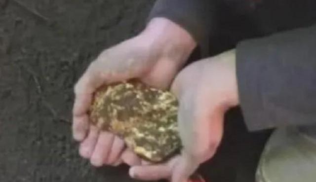 隨后,老楊帶著石塊走出洞口,隨著石塊上的泥土被清理干凈,老楊發現這里是什么石塊,更像是金磚。由于是泛起的閃閃發光的金色,更是讓老楊異常的激動。