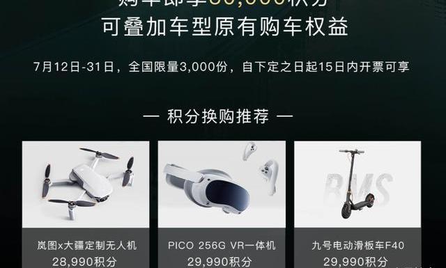 面對即將到來的品牌三周年紀念日,嵐圖汽車也是帶來滿滿誠意,直接推出了“嵐圖三周年寵粉節權益超值回饋”活動。7月12日-31日購車的消費者,在原有購車權益的基礎上,嵐圖再給到額外30000積分。積分可直接兌換大疆定制無人機、投影儀、九號平衡車、PICO256GVR一體機等諸多精品好禮。