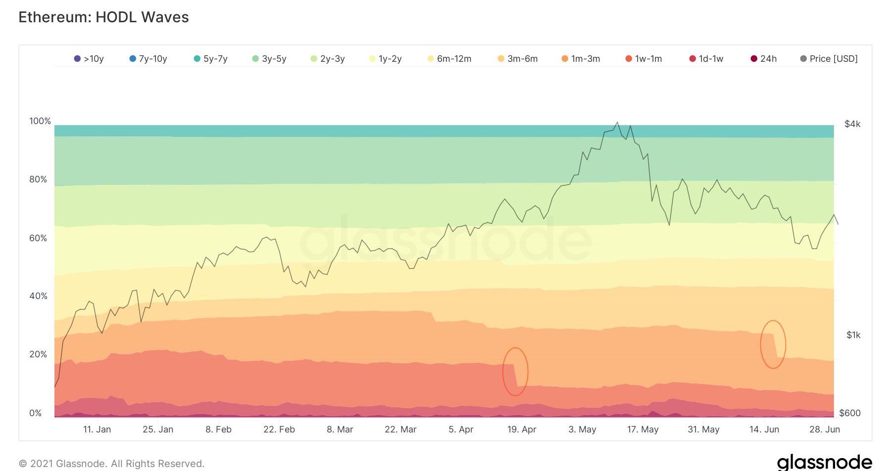 第二季度中,幣齡為1周至1個月的ETH占總流通量的比例降超8%,幣齡為3到6個月的ETH占比增加約14%。從總體來看,幣齡超過3個月的ETH的占比正在擴大。