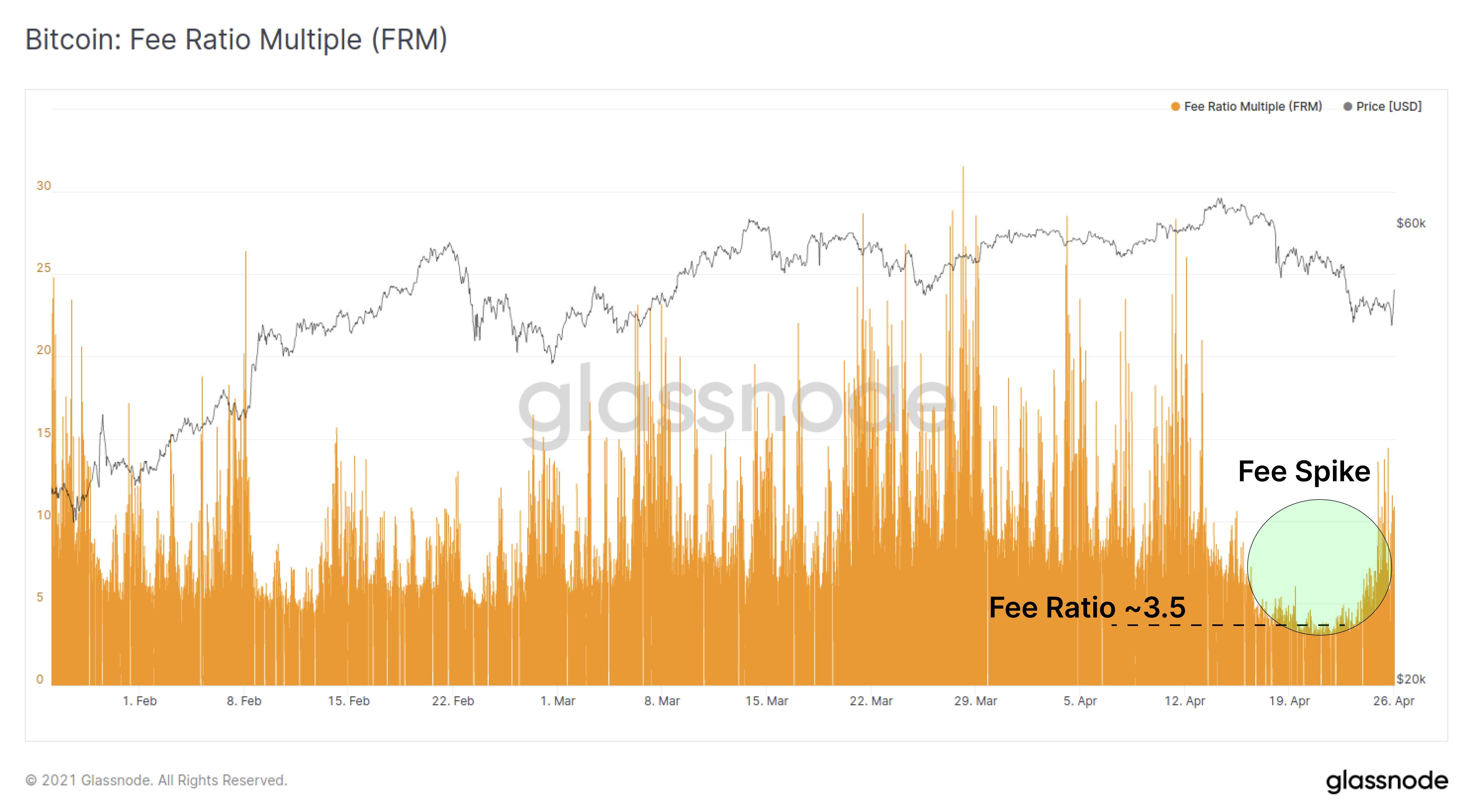 最后,由于過去幾周高昂的比特幣交易費用,手續費比例倍數下降至3.5左右,因為費用在總區塊獎勵中所占的份額越來越大。費用比率倍數的下降對網絡安全而言是一個積極的信號,因為它表明費用在安全預算中正逐漸占據更大的地位。在整個牛市中,比特幣費用比率倍數一直保持在7到8左右的水平,這表明費用占總區塊獎勵的12%至15%左右。