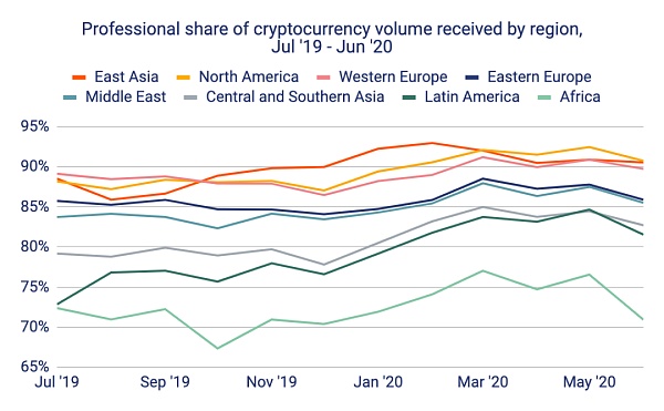 從2019年12月左右開始,北美由100萬美元以上的轉讓總價值所占比例從46%上升到2020年5月的57%的高點。與此相對應的是,北美活動的整體專業市場份額從2019年12月的87%上升到2020年5月的92%的高點。換句話說,自2019年12月以來,北美專業市場的主導地位越來越高,似乎幾乎完全是由價值100萬美元或更多的加密貨幣的轉移所驅動,我們認為其中許多是來自機構投資者。