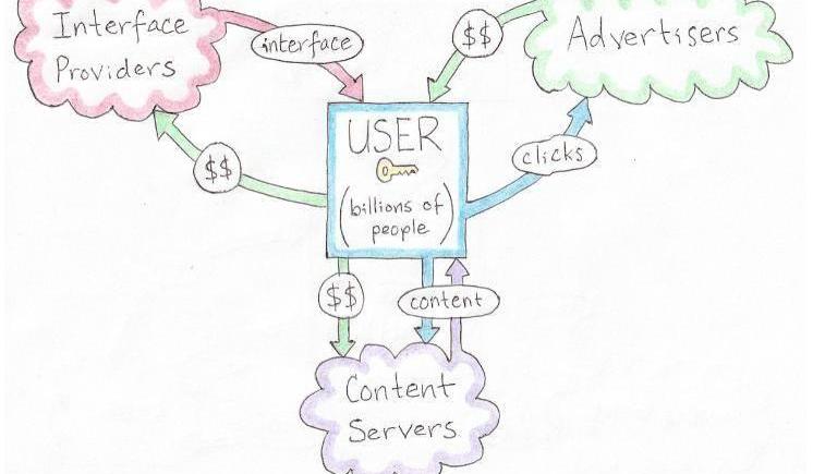 為此,界面提供商可以收費,用戶可以由產生的廣告收入支付。與內容服務器一樣,由于用戶的轉換成本非常低,可以預期界面提供商之間會出現激烈的競爭。因此,用戶和廣告商不會去控制內容和界面的平臺,而是廣告商、內容服務器和界面提供商都會去爭取用戶,激烈爭搶用戶的注意力和價值。