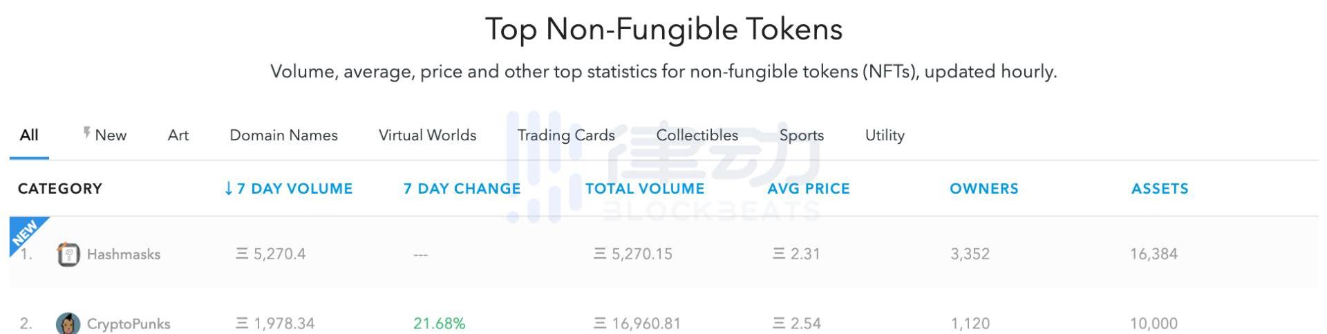 Hashmasks作為近期最熱門的NFT盲盒項目,自誕生不到一周的時間內,便空降OpenSea榜首并遙遙領先,總成交額高達5270ETH,約合790萬美元。