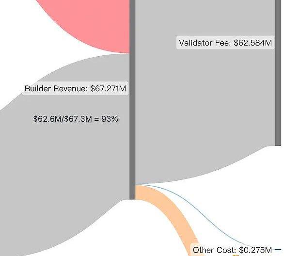 然而,盡管構建者的收入達到了令人矚目的6730萬美元,但93%被分配給接力拍賣中的出價,以補償驗證者,確保驗證者最終會提議區塊。因此,這兩個月的構建者的實際收入僅為440萬美元。驗證者在2023年的前兩個月收到了6260萬美元。