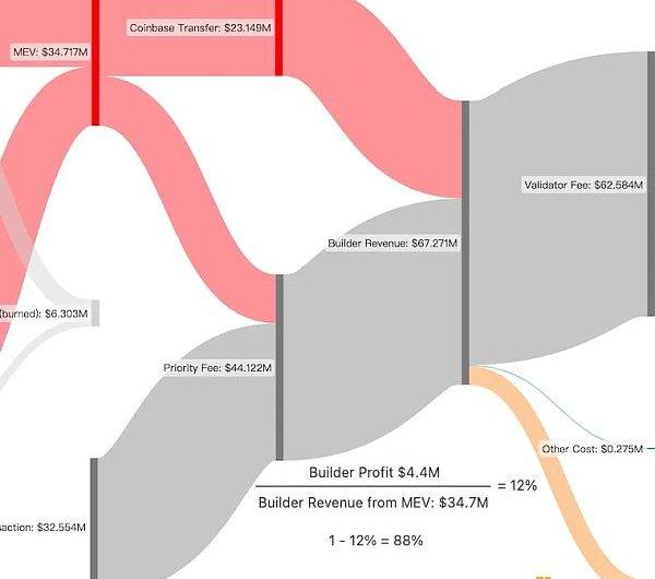 在這些MEV中,2310萬美元直接通過coinbase.transfer()轉移到構建者的地址,剩下的1160萬美元作為優先費用支付給構建者。
