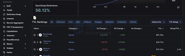 讓我們用數據來客觀評價一下zkSyncEra的這些DEX應用。據DefiLlama數據顯示,目前zkSyncEra上TVL排名在SyncSwap之后的分別是:Velocore、Mute.io、SpaceFi。