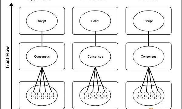 直到Ethereum問世后又為了這信任架構帶來創新。與Bitcoin的信任架構最大的差別在于最上層不再是被受局限的script語言,取而代之是一個圖靈完備的程式執行器:EVM。透過EVM任何人可以在Ethereum網路上面打造自己的去中心化服務,像是AAVE,ENS或Uniswap…等。這些去中心化服務都是透過EVM來執行,而EVM執行結果的正確性則是由下層的節點保證。透過這樣的機制,使得想打造不同的DApps人們不再需要另外建立一個去中心化網路來獲得信任,而是直接使用Ethereum的信任網路,等于是將信任給模組化。這樣的信任模組化架構帶來的好處是大幅度地降低DApps創新的門檻,因為不再需要為了一個特定的DApp去建立另一套去中心化網路。
