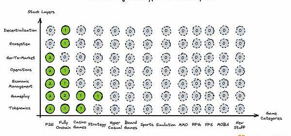 單元格:每個單元格中的數字表示crypto領域已經看到的相對成功的嘗試次數。每一款熱門游戲——即使最終失敗,也會推動crypto技術向前發展,讓我們離終極解決方案更近一步。截至今天,最著名的迭代發生在P2E、完全鏈上的、菠菜游戲和策略游戲。