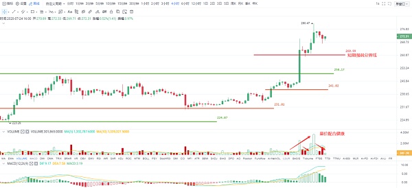 建議未來兩天重點關注260(替換昨日256)一線支撐,可講該價位看做短期強弱分界線,只要不跌破該價位,一切回落都看作是良性調整即可(激進的可參考266)。上方阻力重點關注前高288區域,首次上破形成有效上破的概率較小,容易出現沖高回落走勢,最好不要在看到新高后盲目追漲。