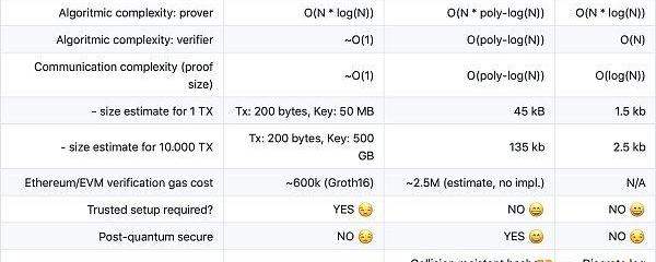 SNARKs(SuccinctNon-interactiveARgumentsofKnowledge)特點:簡潔證明大小,證明驗證耗時相比較短,但需要對每一個電路進行可信設置。代表項目:Groth16。
