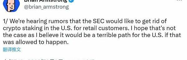 2月9日,Coinbase聯合創始人兼首席執行官BrianArmstrong發推表示,「我們聽到傳聞,稱美國證券交易委員會希望在美國取消零售客戶的加密資產質押服務,我希望情況并非如此,因為我認為如果允許這種情況發生,對美國來說將是一條可怕的道路」。