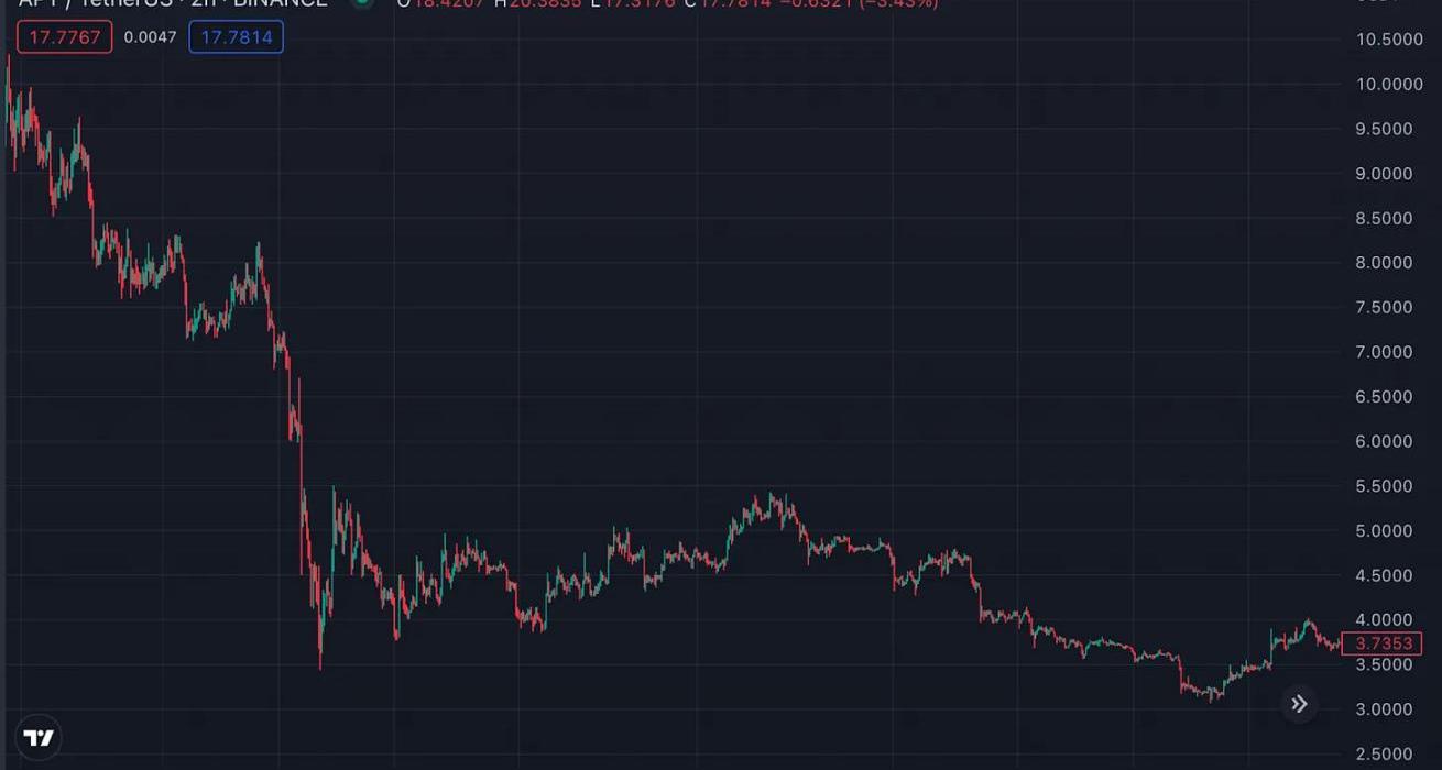 在FTX崩盤后市場暴跌,但APT和其他「Sam幣」受到更嚴重的打擊,在11月7日至12月29日期間下跌了55.9%。其12月的3.08美元低點對該網絡的FDV估值約為31億美元,低于其最近一次融資時的估值。