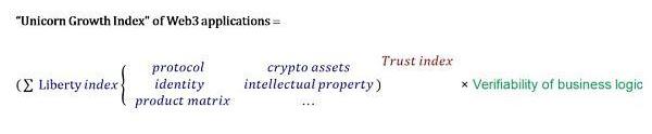 因此,CGVResearch團隊認為,Web3應用的成功,得益于“自由”和“信任”的數字要素基礎,加上商業邏輯的可驗證,三者缺一不可,并依此提出Web3應用的「獨角獸成長指數」: