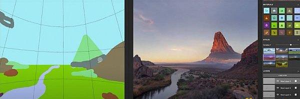 NVIDIACanvas可以讓藝術家無縫地生成背景。在AI加持下,只需要通過簡單的筆觸對背景進行排布就能自動生成精細的背景。