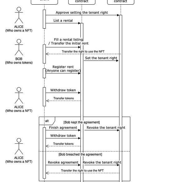 其相較于ERC4907更加復雜,其中包括留置權持有人、所有者和用戶三類角色,其中留置權持有人以及所有者有權有權轉讓所有者和用戶角色,而用戶有權利轉移用戶角色,智能合約則作為主要的執行者,我們看到其整體的執行邏輯十分復雜。在2020年EIP2615被提出后,始終沒有進展,或許與其復雜的執行邏輯以及鏈上執行成本,并且與實際的NFT市場發展、需求并不一致有關。