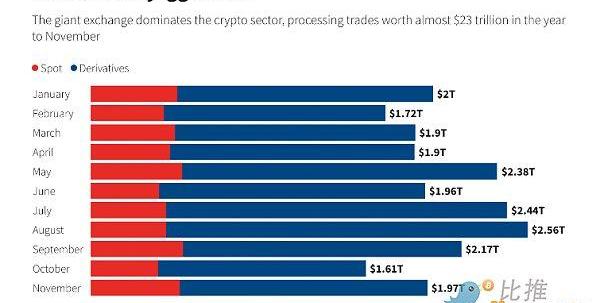 Binance對現貨交易收取高達0.1%的費用,衍生品的費用結構更為復雜。路透社根據研究人員CryptoCompare的數據計算,截至10月的一年現貨交易量為4.6萬億美元,幣安的收入可能高達46億美元。Binance對其16萬億美元的衍生品交易量收取高達0.04%的費用,可能已經賺取了高達64億美元的收入。
