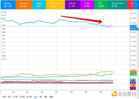 TradingView記錄了比特幣市值占比走勢:5月6日,比特幣市值占比超過68%,隨后一路下跌,8月3日觸及年底低點61.5%。與此同時,比特幣價格卻從9100美元漲至12000美元。