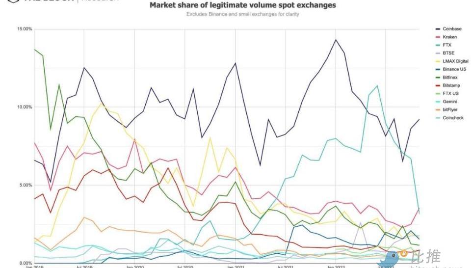 7、值得注意的中心化交易所市場份額:Binance為75.1%,Coinbase為9.2%,Kraken為3.6%,FTX為3.1%: