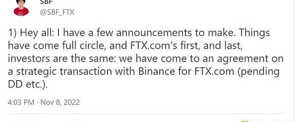 《信息報》報道稱,SBF“發了一條消息,從未想過他會發這樣的消息”。他向CZ求救。不出所料,SBF第二天宣布,幣安已同意收購它們,并保證客戶將受到保護,所有資產將按1:1支付。