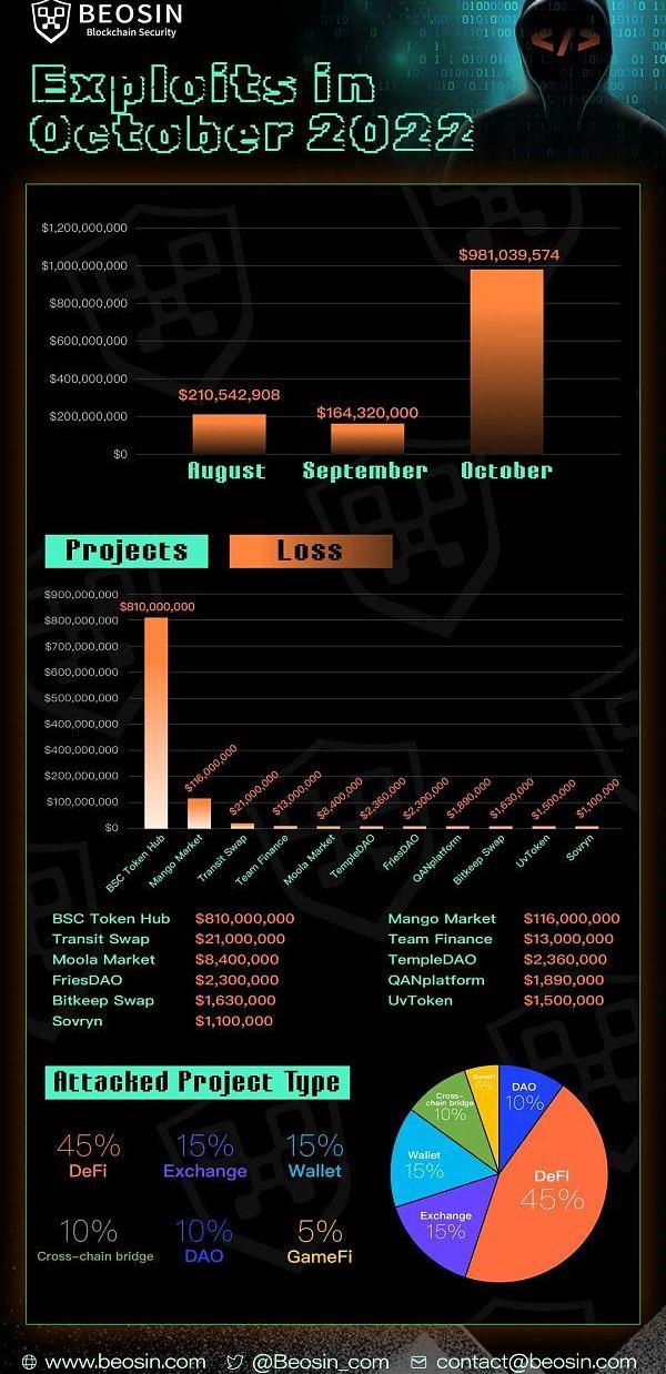 XRP/HKD+1.42%又到了每月安全盤點時刻!根據區塊鏈安全審計公司Beosin旗下BeosinEagleEye安全風險監控、預警與阻斷平臺監測顯示,2022年10月,各類安全事件數量和涉及金額較9月大幅上升。10月發生較典型安全事件超『25』起,其中攻擊類安全事件損失總金額約9億8104萬美元,為2022年以來區塊鏈領域損失金額最高的一個月。