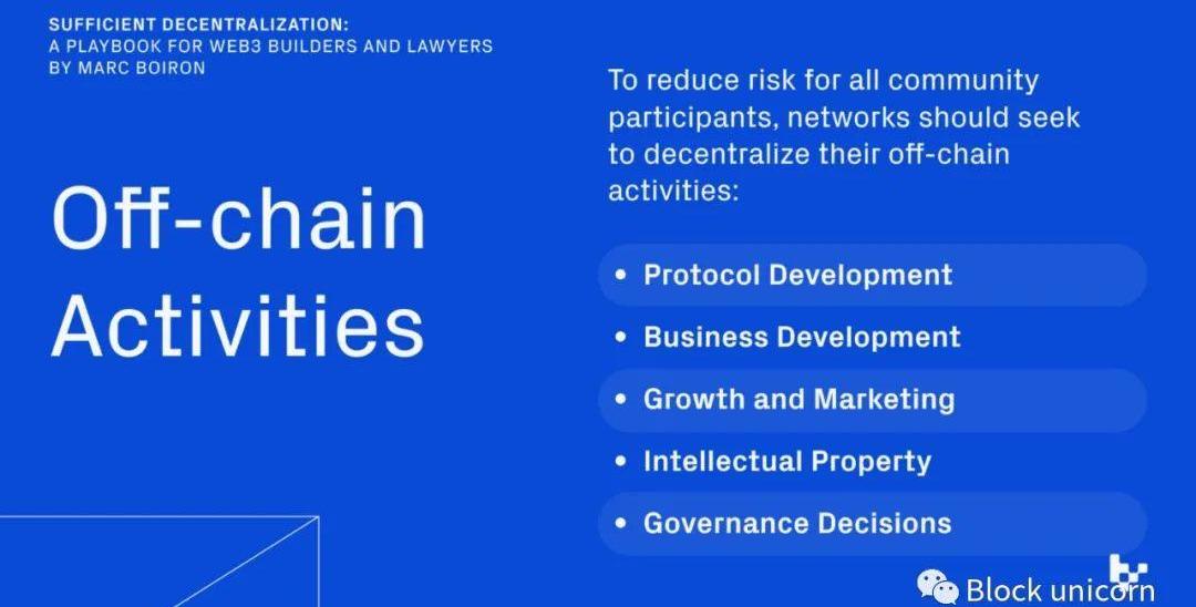 然而,協議的技術及其自主操作可能并不總是驅動給定加密資產價值的唯一合理因素。那些合理期望從加密資產中獲利的人可能會認為附加的鏈下活動是價值驅動的。因此,為了減少任何Web3參與者的風險,社區還應尋求去中心化鏈下活動,包括以下方面: