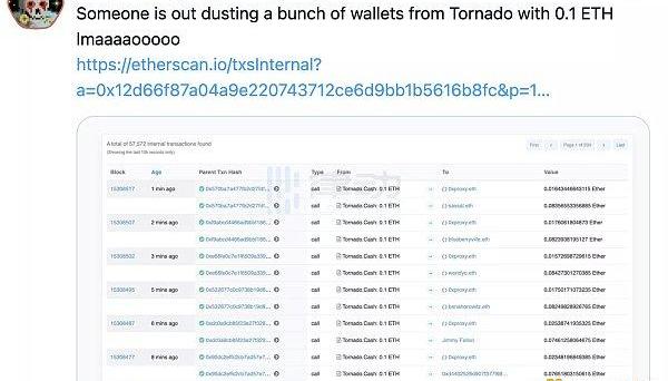 在監管消息傳出后不久,名為@Depression2019的用戶就在Twitter上發文,表示自己積累了大量名人以及KOL的錢包地址,并會通過TornadoCash向這些發送0.1ETH。不少用戶紛紛在下方互動,以為這種公開反抗監管的行為只是說笑。