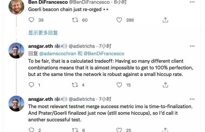 以太坊基金會的研究人員AnsgarDietrichs認為這項測試是成功的。他在推特上表示,在這樣的演習中,成功與否的衡量標準在于最終完成的時間。GalaxyDigital的另一位合伙人表示,雖然合并后的參與率有所下降,但可能是其中一些客戶端出現了問題。但總的來說,合并仍然是成功的。