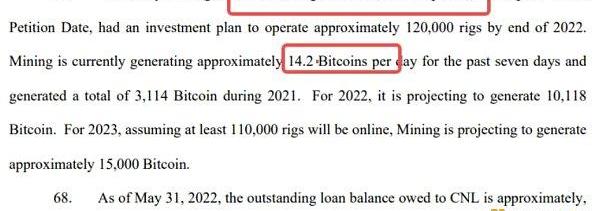 據破產申請披露,Celsius運營著美國最大的礦業公司之一。為了促進公司未來收益的增長,博取更大的收益率,Celsius早在2020年底就涉足了礦業。其具體表現是為挖礦業務提供了高達7.5億美金的循環貸款,而Celsius將其定義為一種對挖礦的長期投資。目前其共有8萬臺礦機,其中4萬余臺在運轉,每天能產出14.2個比特幣。Celsius希望用這種方式逐漸收回貸款的成本。