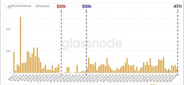 在目前的2022年市場中,在2021年11月的歷史前高之后,到目前為止我們有一個類似的結構。我們可以看到類似的重新分配模式發生在3萬美元的底線周圍,最初建立于2021年5月至7月。在今年5-6月的過程中,我們可以看到價格交易下降到2萬美元的區域,這成為投資者投降和新買家的重要觸發點,因此成為比特幣轉手的節點。