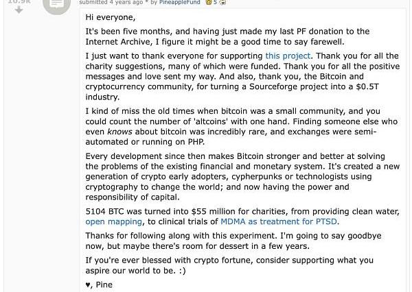 這是匿名比特幣捐贈者Pine的告別帖,他的Pineapple基金會向慈善機構捐贈了5500萬美元。