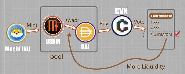 或許是受CurveWar飛輪效應的啟發,MochiProtocol也打算開啟屬于自己的飛輪效應。MochiProtocol使用其治理代幣$MOCHIINU,對其USDM穩定幣在Curve中的流動性進行激勵,并利用其持有的大量$MOCHIINU憑空鑄造了大量的USDM。然后,MochiProtocol將這些USDM換成DAI,用?DAI大量買入$CVX(掌握大量CRV投票權的ConvexProtocol的治理通證),以進一步爭奪流動性,并繼續利用這些流動性將USDM換成DAI,然后再購買$CVX,循環往復。當USDM的流動性達到1億美金時,MochiProtocol開始套現跑路,耗盡池中的流動性,使得USDM掛鉤失效,完成對流動性提供者的收割。