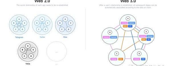 把社交關系和產生的內容還給用戶是Web3社交要做的事情,現在已經有很多Web3社交的產品/協議可以把用戶的社交關系和內容存放在鏈上或其他去中心化的存儲中,也就是說用戶可以在不同的平臺來共享這些數據。比如能夠做到在魔獸世界里查看你的微信好友和Steam好友,在微博里看到你在twitter,instagram發的動態或圖片。