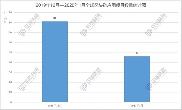 根據互鏈脈搏研究院不完全統計,2020年1月,全球共披露區塊鏈應用項目46個,相較2019年12月披露項目,環比下降約43.2%,其中中國披露項目29個,較上月53個環比下降45.3%。