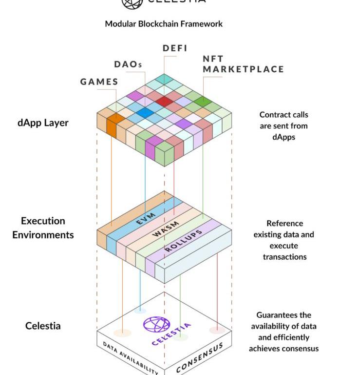 除以太坊擴容方案Rollup外,Celestia能夠應用于所有的單片式區塊鏈。在基于Celestia的Rollup架構上,Celestia作為數據可用性層和共識層,職能僅包括保證數據可用性和交易排序,并不驗證交易的有效性。搭建在其上的Rollup作為結算層和執行層,負責交易的驗證和執行。Celestia和Evmos合作構建的Cevmos架構讓模塊化更進一步,Evmos作為Cevmos專用的結算層分離出來,進一步提高了可擴展性。Evmos是基于Tendermint共識和CosmosSDK搭建的EVM兼容智能合約型公鏈,Cevmos將Tendermint共識替換成Optimint共識,使開發人員能在其上部署模塊化的新鏈Celestia,Evmos作為專用的結算層稱為結算Rollup,在結算Rollup上部署Rollup的遞歸結構,即Cevmos是Rollup的Rollup。