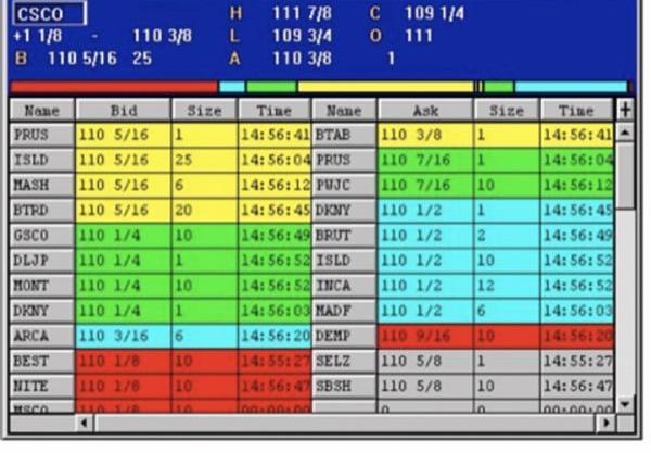 到1980年代中期,納斯達克推出了一個界面,即納斯達克工作站,它可以在標準臺式計算機上運行。該系統允許經紀人相互做廣告和互動,蒙太奇顯示指定做市商的出價和出價,按價格排列。配色區域顯示遠離全國最佳價格的深度水平。