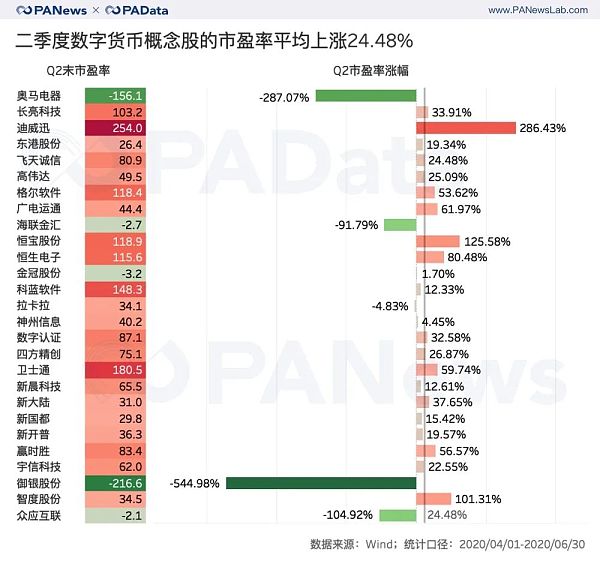 從市盈率(PE)來看,數字貨幣概念股6月30日的平均估值約為53.27倍,二季度估值漲幅的中位數約為24.48%,整體處于較高位置。其中,漲幅較高的有迪威迅,達到了286.43%,6月30日的PE約為254倍,處于高位。與之相似的還有恒寶股份、恒生電子,都屬于估值較高,且漲幅較高的概念股。另外值得關注的是奧馬電器和御銀股份,二季度估值的跌幅都超過了200%。