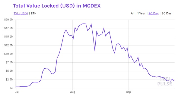 截止到9月26日,DefiPluse的數據顯示MCDex鎖倉量(TVL)達到210萬美金,最高峰接近1900萬美金,現TVL排名所有以太坊DEFI項目第31名。由于AMM交易機制需要流動性挖礦,我們看到除了ETH擁有2400個質押量外,LINK、COMP等永續合約交易的抵押物總額仍處于低位,分別為2700多個LINK和65個COMP。