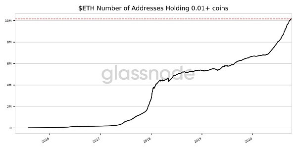 據glassnode的數據顯示,持有至少0.01個ETH的地址數量達到了歷史新高10,116,076。