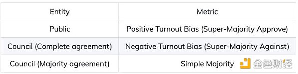 每個提案,都將“贊成”和“反對”的票數考慮在內,作為投票率或投票代幣總數的考慮因素。