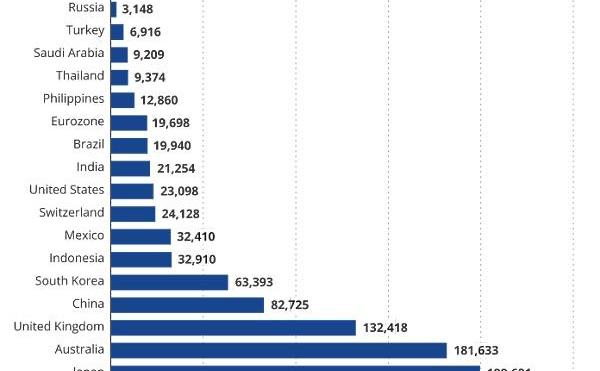 在各個國家的基礎上,日本的數據超出了記錄。它有很多錢,只有很少的黃金。