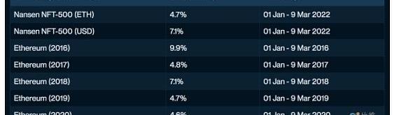 截至2022年3月9日,Nansen藝術NFT指數的回報率為30.8%和-6.1%。同一時期,社交-100指數的回報率為93.7%和39%。