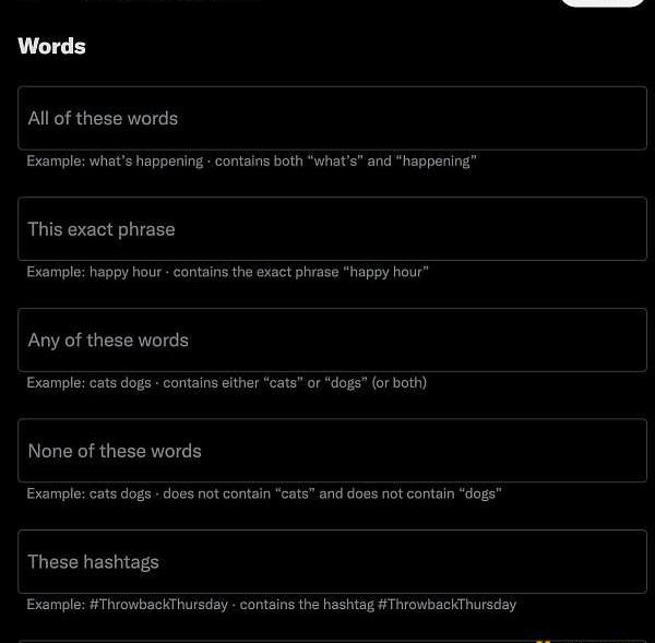 我通常填寫“所有這些詞”和/或“這些詞中的任何一個”下的方框。我通常在尋找人們在推特上發布的一些特定事件或主題,我想看看最受歡迎的推文是什么。