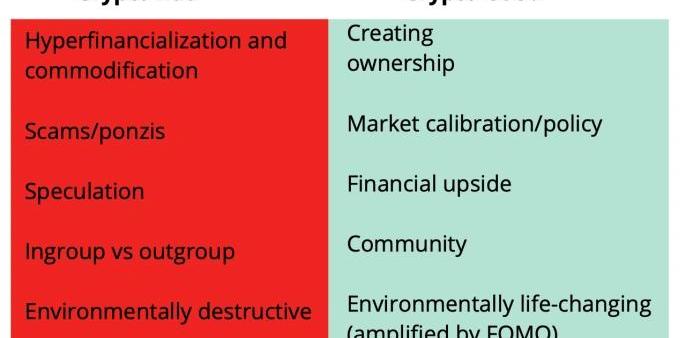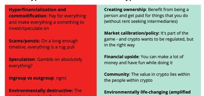 我首先要討論"CryptoBad"的敘述,然后是"CryptoGood",以強調解釋上的差異--CryptoBad看到了超金融化,而CryptoGood看到了創造所有權的能力,等等。