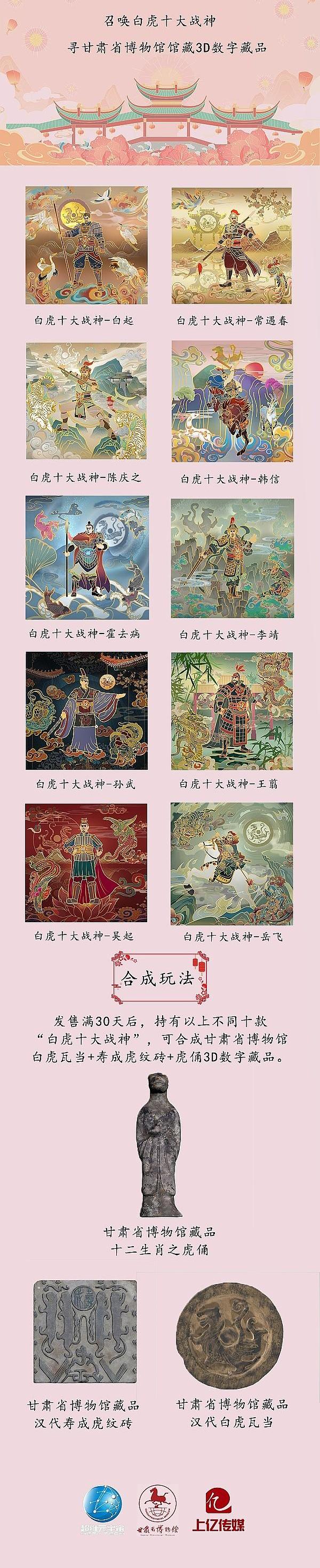 此次推出的“白虎十大戰神”系列數字藏品同樣延續了合成權益玩法。藏品在發售一個月后,用戶持有不同十款“白虎十大戰神”,可合成甘肅省博物館白虎瓦當+壽成虎紋磚+虎俑3D數字藏品,進一步解鎖新驚喜。