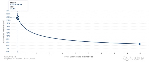 最重要的原因之一就是預期可以獲得相對低風險的穩定收益。如果剛好只有524,288ETH的存入,那么,其APR收益可以達到21.6%;如果參與質押的ETH達到2,450,000,其收益率也能達到10%;即便是鎖定的ETH高達10,000,000,其APR收益也可以到4.9%,遠高于其他DeFi協議的ETH存儲收益。