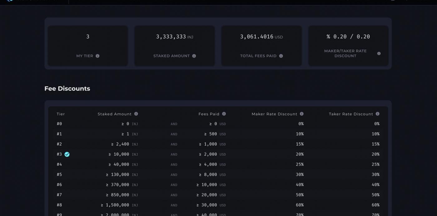 同時,平臺還將依據用戶的近30天交易費用與質押INJ的數量,將會升級到對應的VIP等級,一邊享受更優惠的交易費率。
